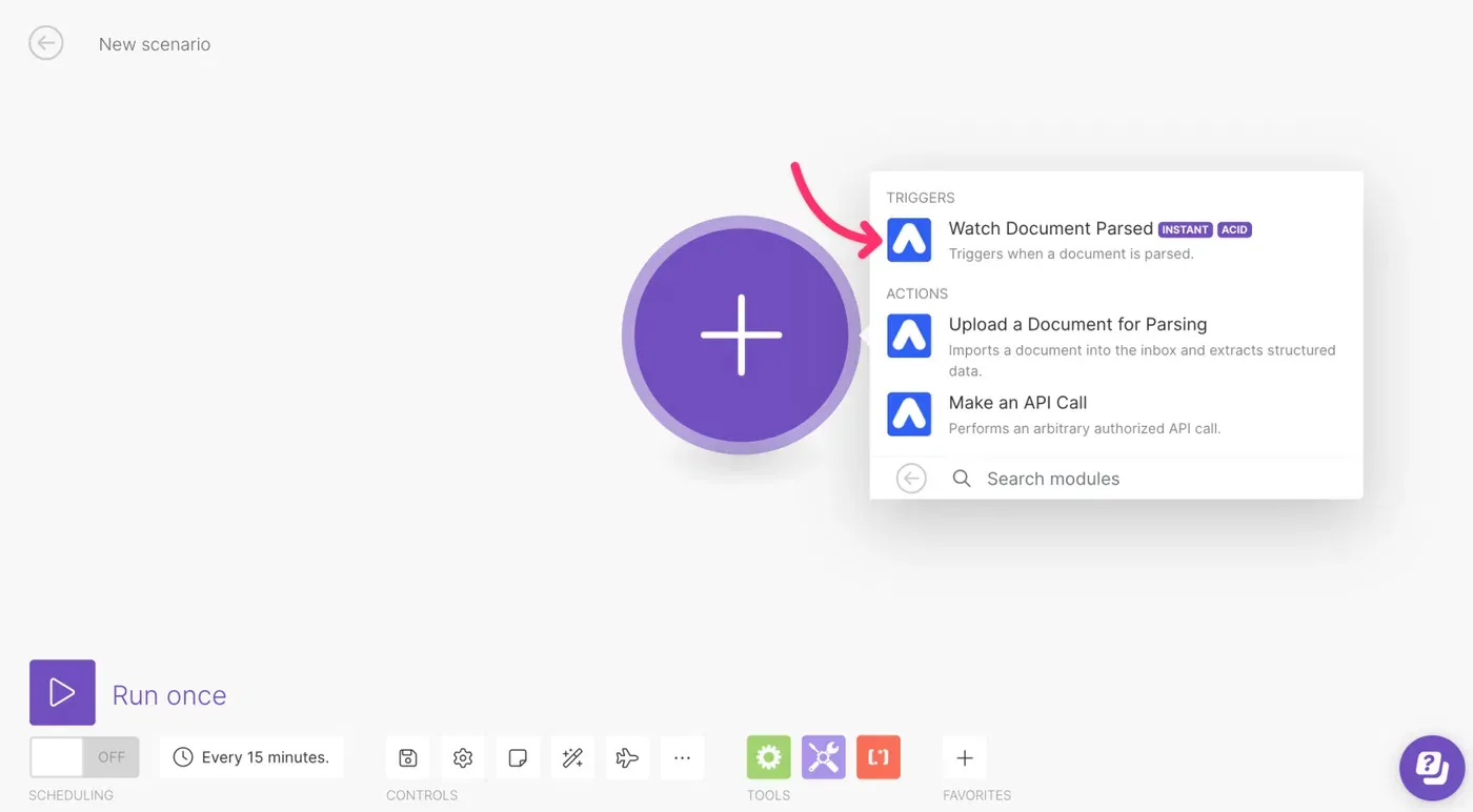 Search for the Airparser app and add it as your first module. Choose “Watch Document Parsed” as the trigger event. This runs every time Airparser parses a document.