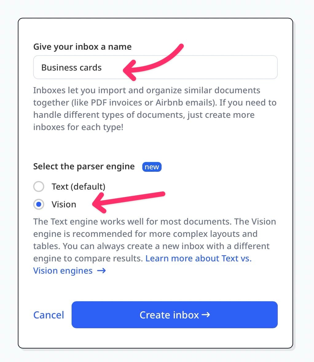 Log into Airparser and create a new inbox for your business cards. Each inbox has its own unique email address, which you can use to forward documents or upload files manually.