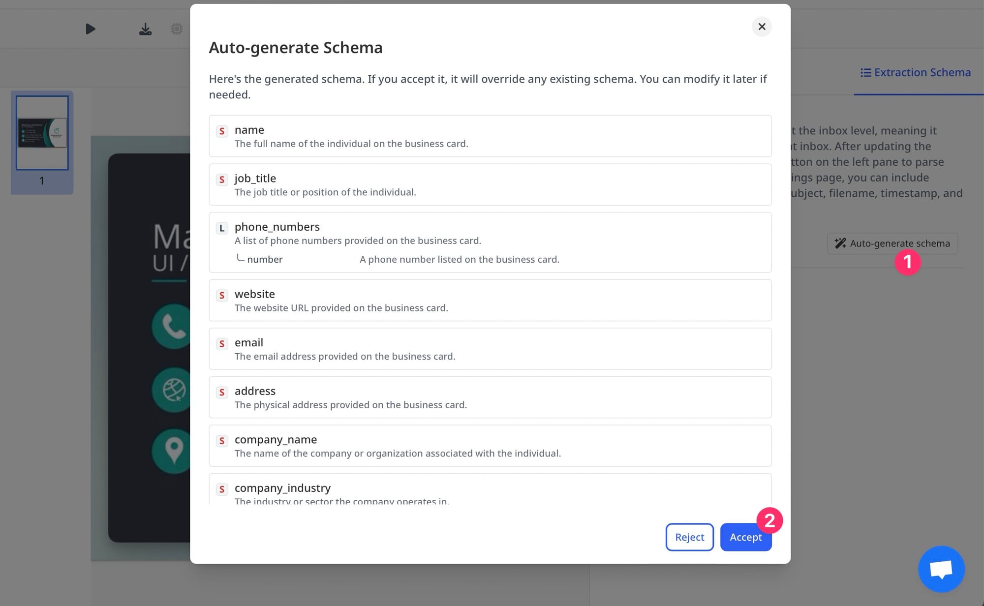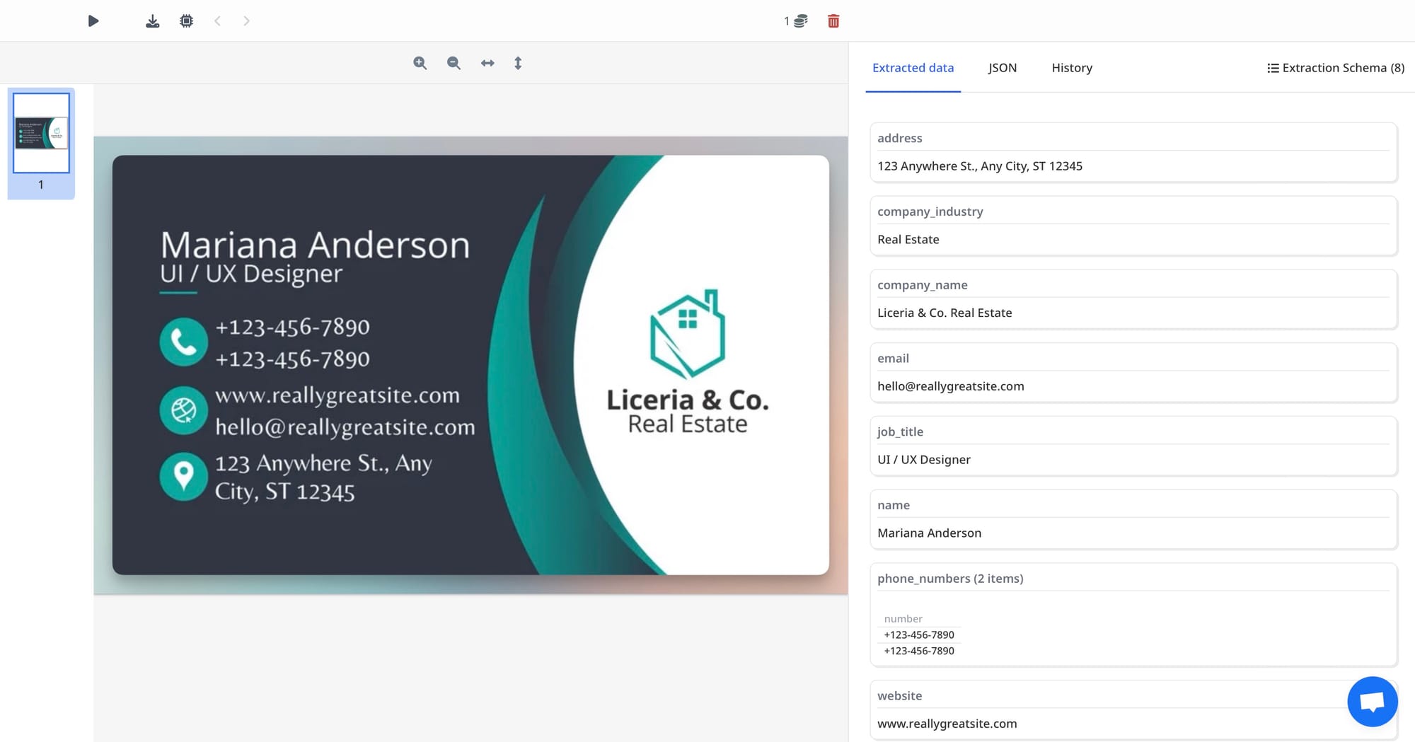 Once a card is uploaded, Airparser shows a preview of the document. Simply list the fields you want to extract, such as: