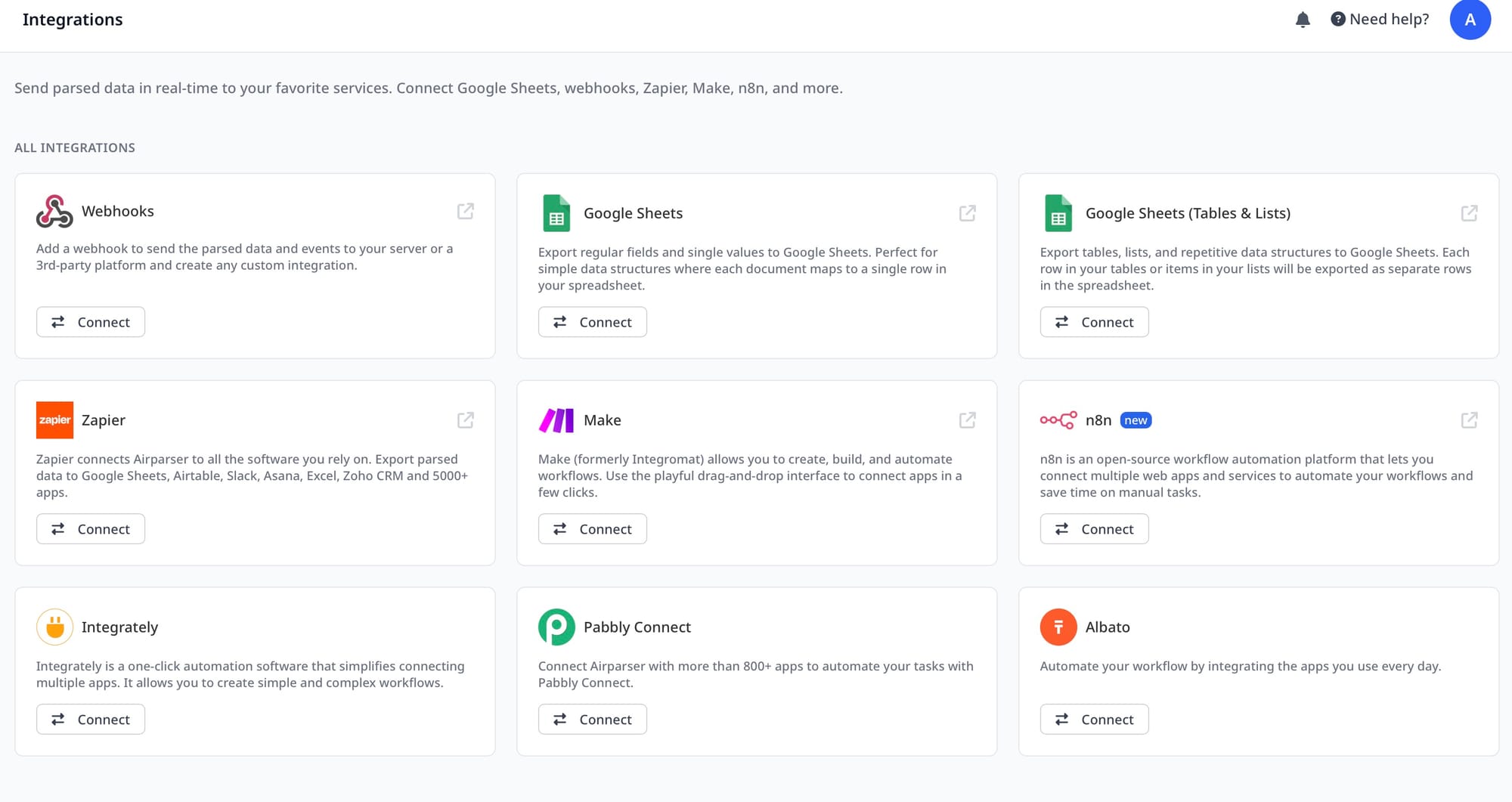 You can also connect it with workflows. For example, see how to integrate Airparser with n8n.