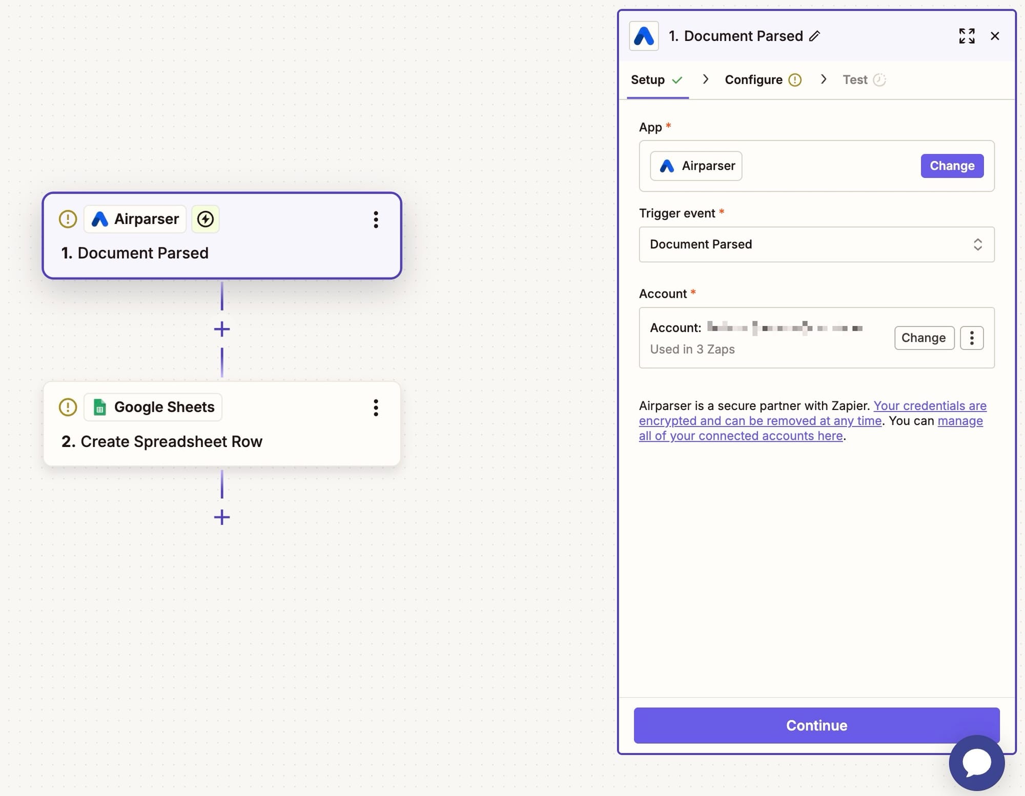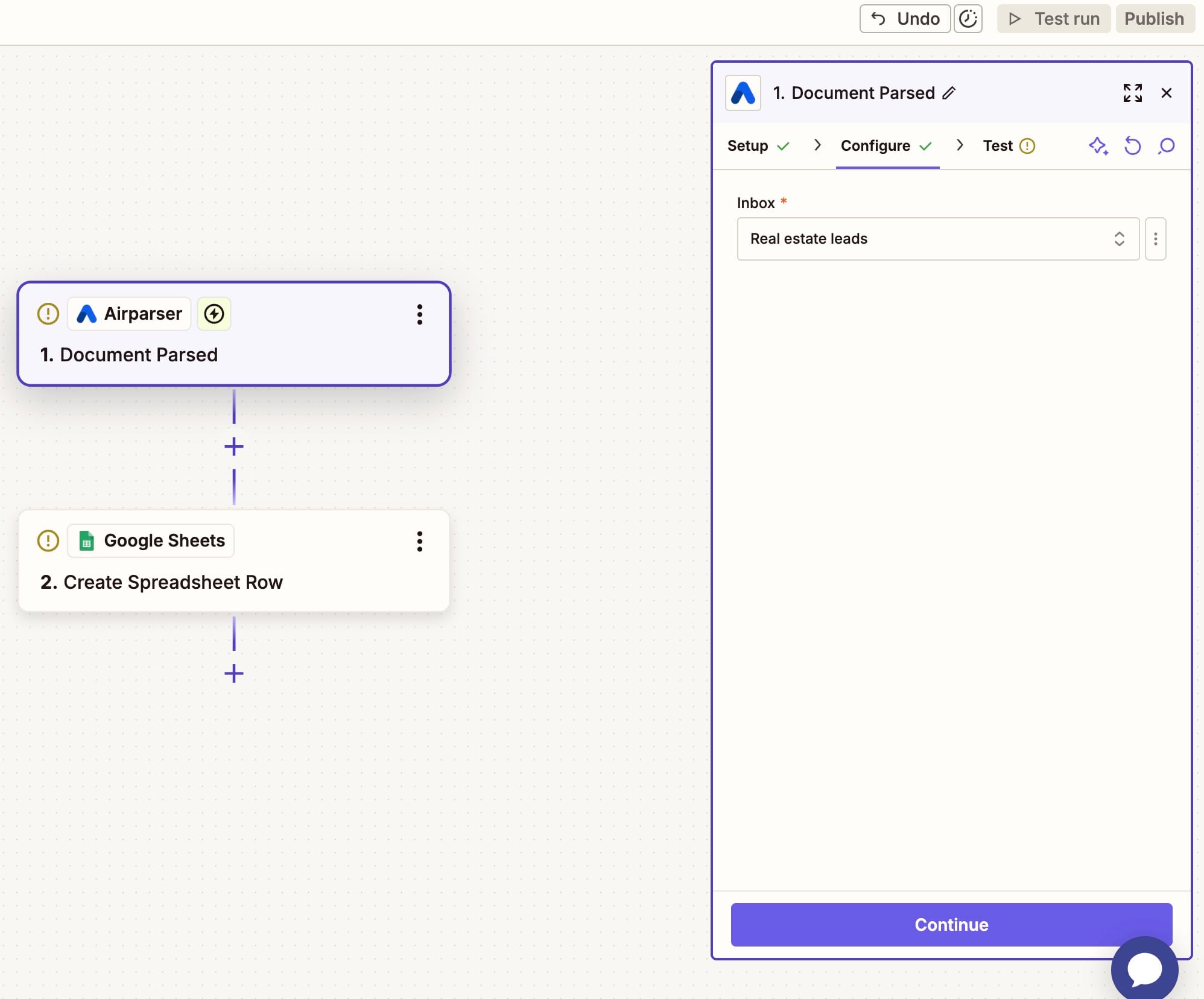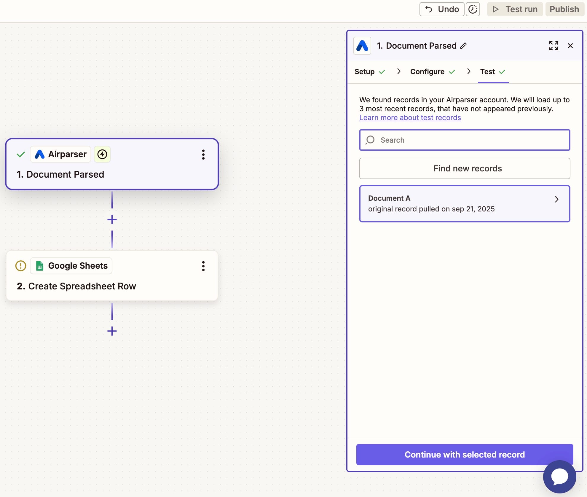 This means that every time a document is parsed in Airparser, Zapier will run your workflow.