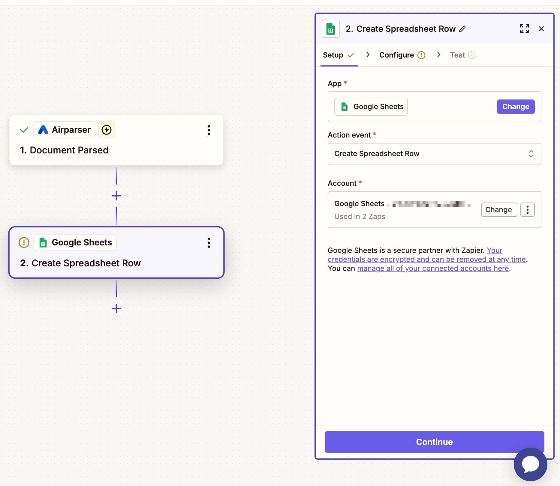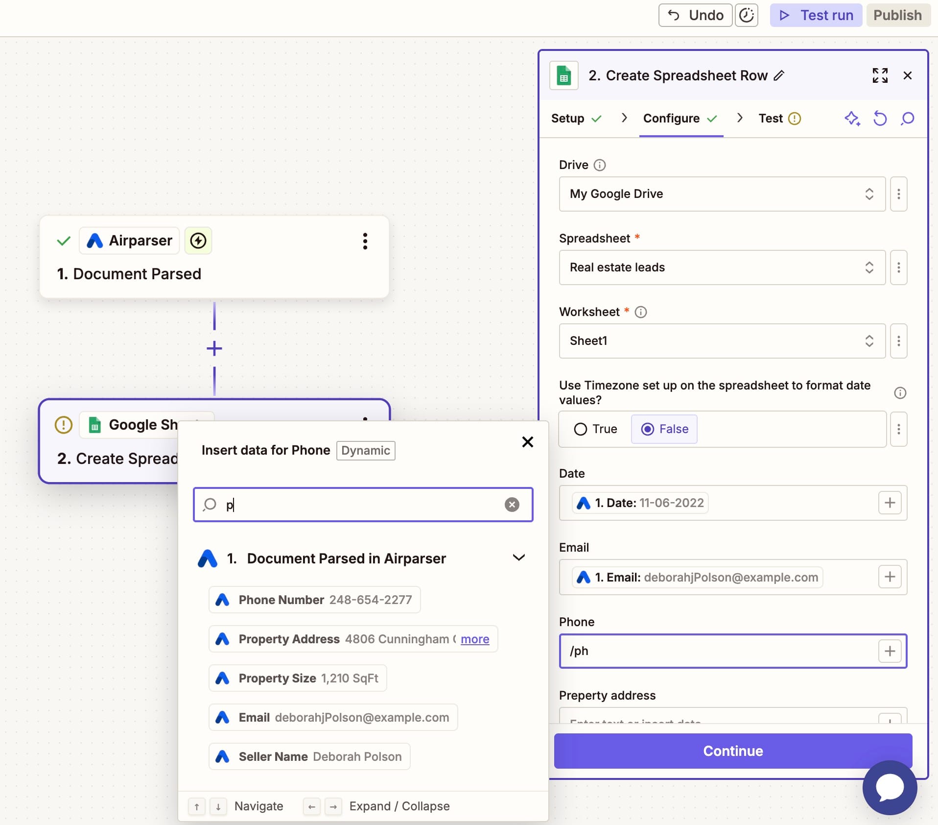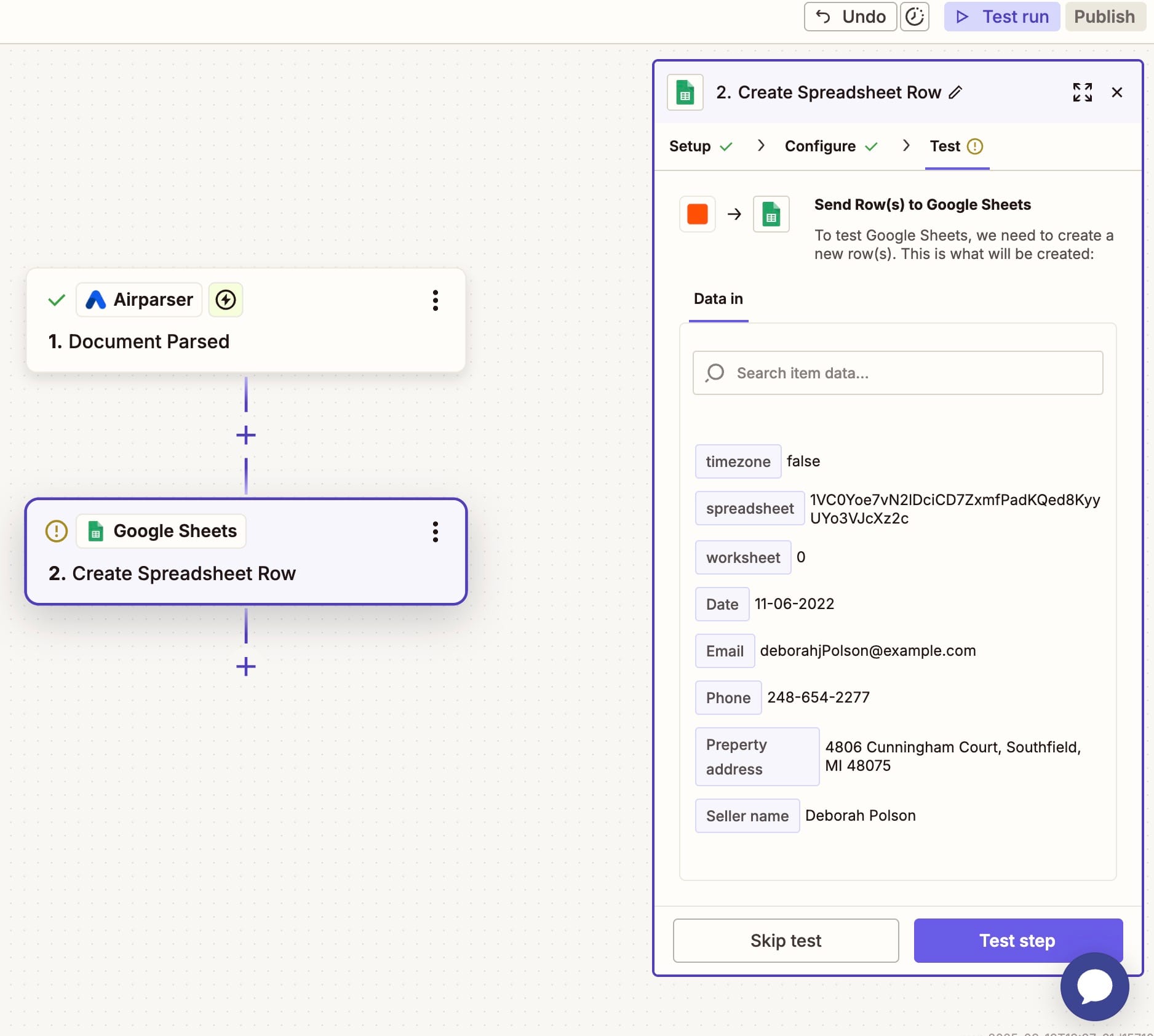 Zapier will automatically load the column headers from your spreadsheet so you can map Airparser fields to them.