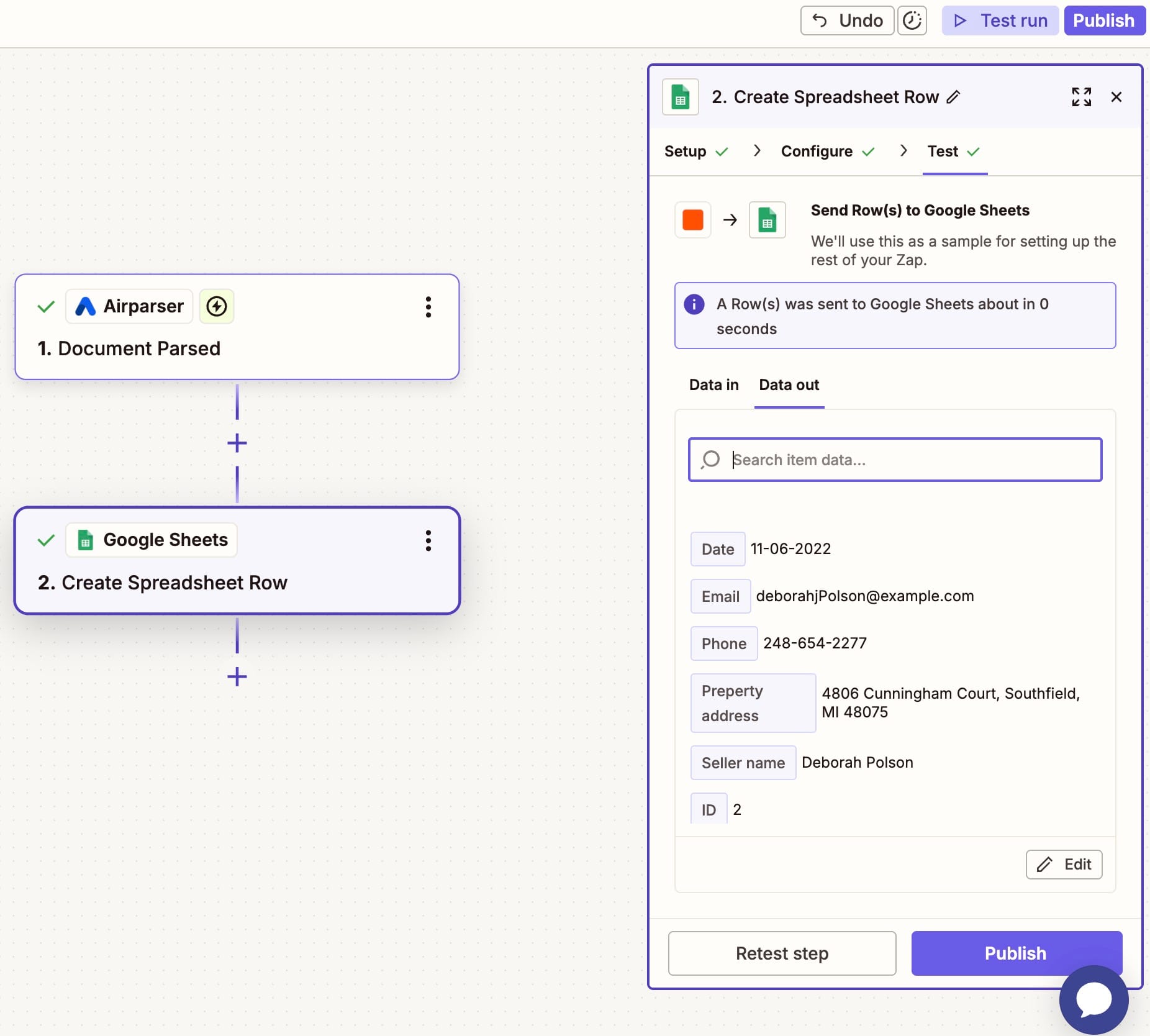Zapier will fetch a sample parsed document from your selected inbox. This ensures you have real data (date, email, phone, etc.) available to map later.
