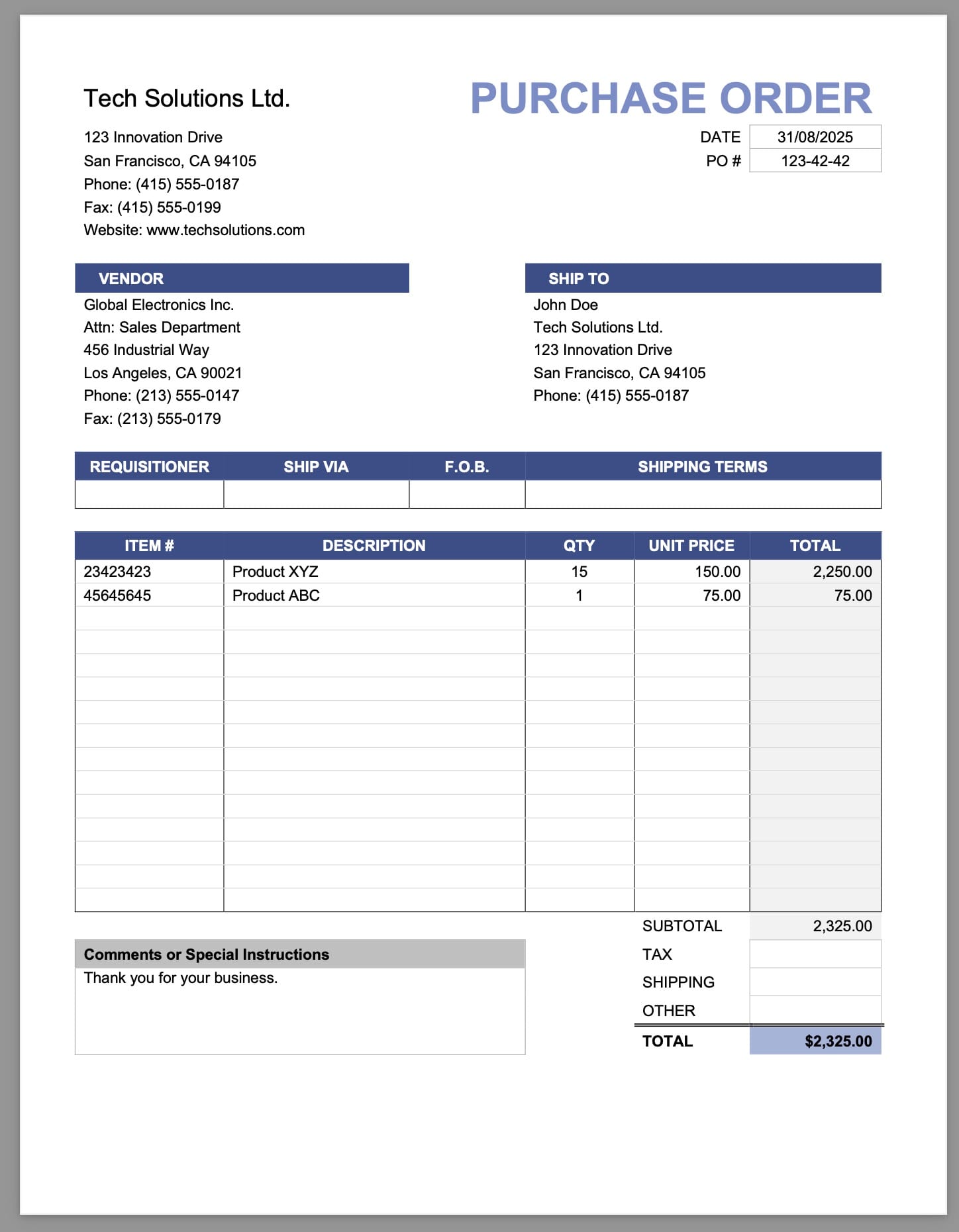 - Header fields: PO number, issue date, vendor name, billing and shipping address