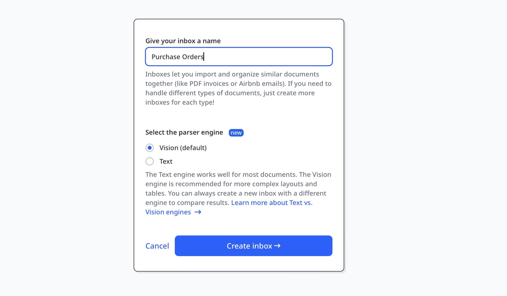 - Choose the Vision engine for scanned POs, image-based formats, or complex tables